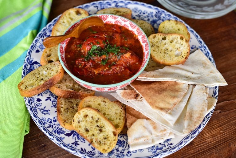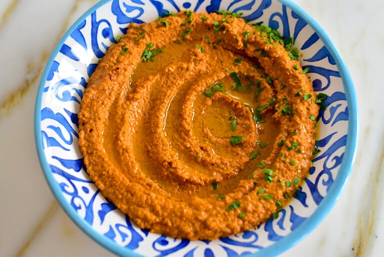 Muhammara, classic Lebanese roasted red pepper walnut dip, has such great texture and flavor. The savory and sweet combo is always a winner, and you’ll be handing out the recipe left and right!