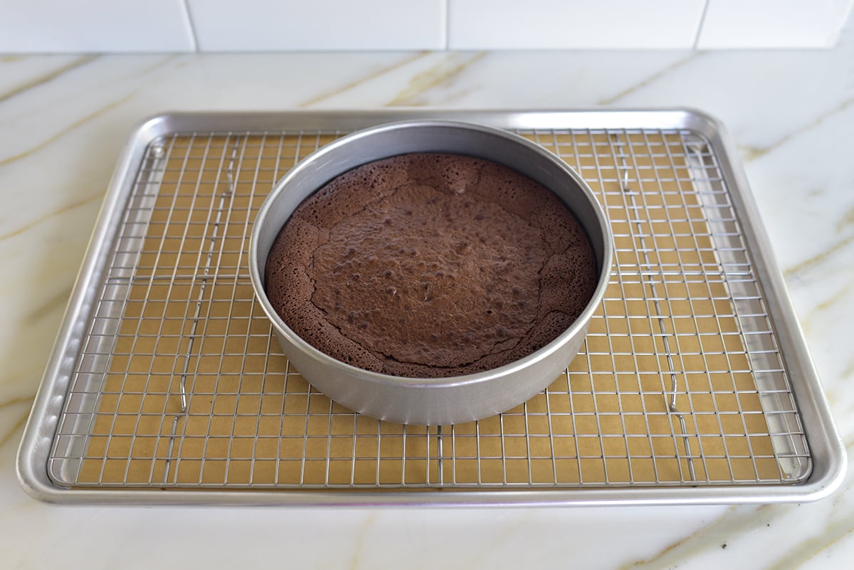 - Pour the batter into the prepared pan. Bake the cake for 24 to 25 minutes, or until the top is crackly and the center no longer looks shiny. Cool the cake for about 15 minutes. Invert the cake out a wire cooling rack so the bottom is facing up. Set the rack over a sheet of parchment.