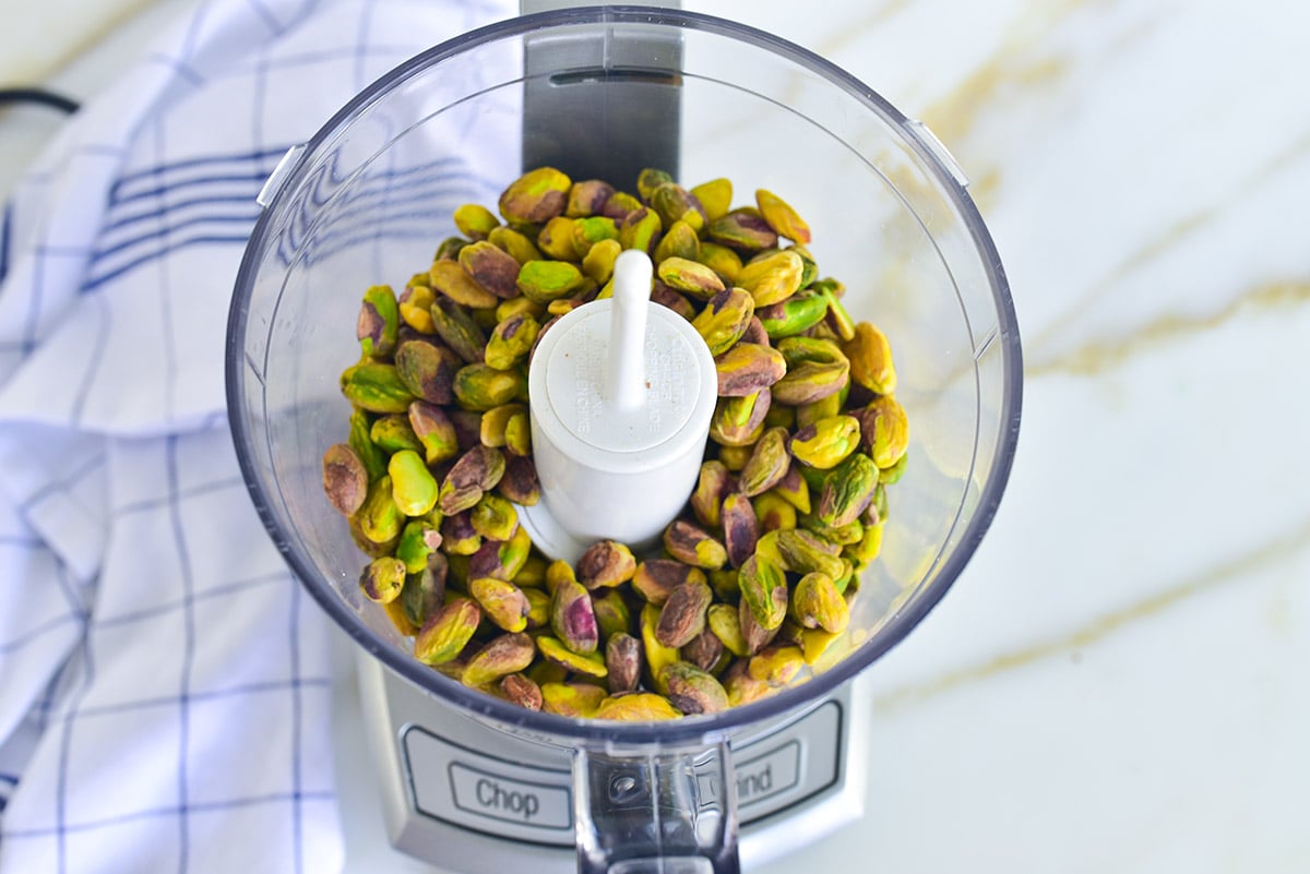 - In a food processor, pulverize the pistchios until they are as finely ground as possible.